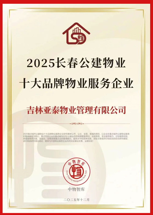 双榜题名,载誉而归——亚泰物业荣获2025年长春住宅及公建物业十大品牌物业服务企业